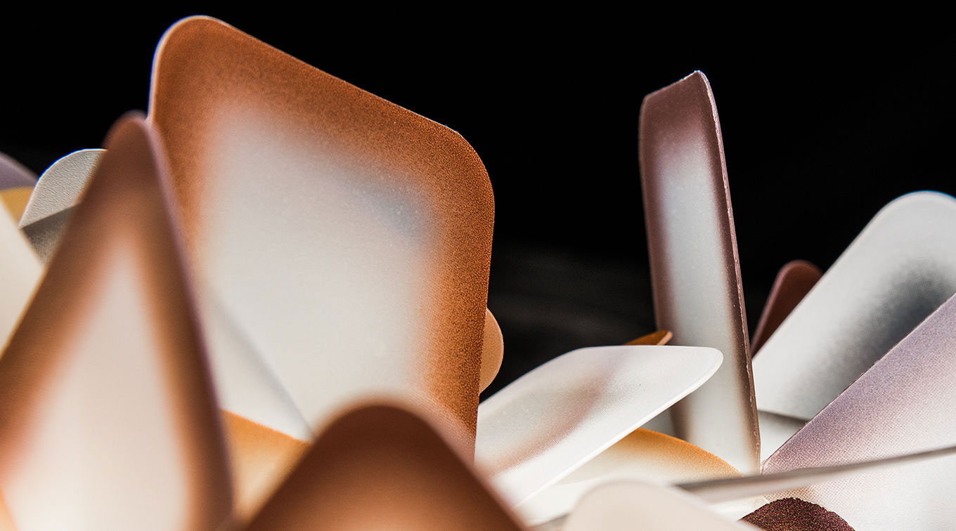 Animates space with elegance and spontaneity, awakening memories of a past full of celebrity divas and limelight with its shape and chromes. LED illuminated cylinders are arranged at different heights around a central ring and alternate shades of precious metals in pastel colours with transparencies. The brushing of the metallisation leaves to the light the task of creating the suggested decorum.